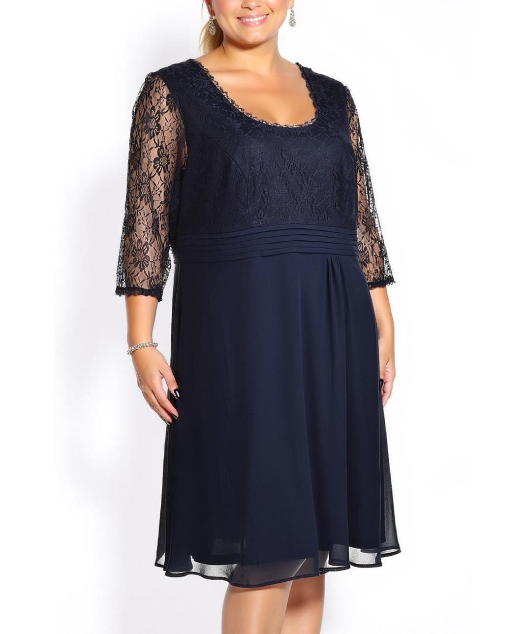 Елегантна официална рокля в тъмносиньо с дантелено гръбче и ръкави 3/4, висока талия с фини плисета, леко разкроена пола до коляното. Подходяща за сватби, коктейли и тържества. Стилен и удобен избор!!