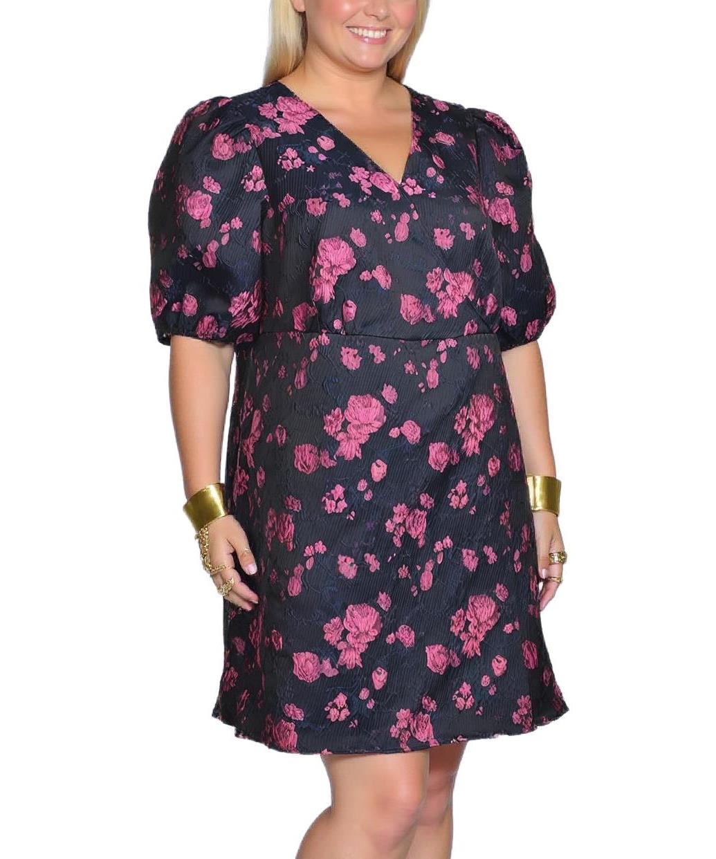 Официална рокля с флорален мотив, характеризираща се с обло деколте и къси буфан ръкави. Основният цвят е черен, украсен с розови цветя. Дължината е до коляното, създавайки елегантен силует. Подходяща за специални поводи.