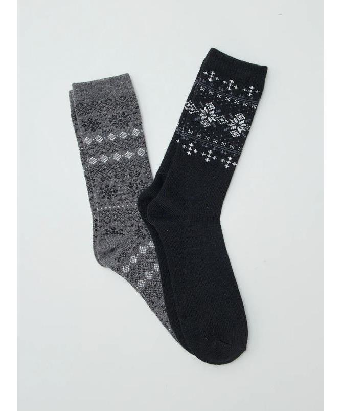 Комплект 2 вълнени чорапи: мека, топла и дишаща вълна; класически зимни десени в черно и сиво. Удобни, дълги, подходящи за ежедневна употреба и студено време. Подходящи за подарък, планина и домашен уют