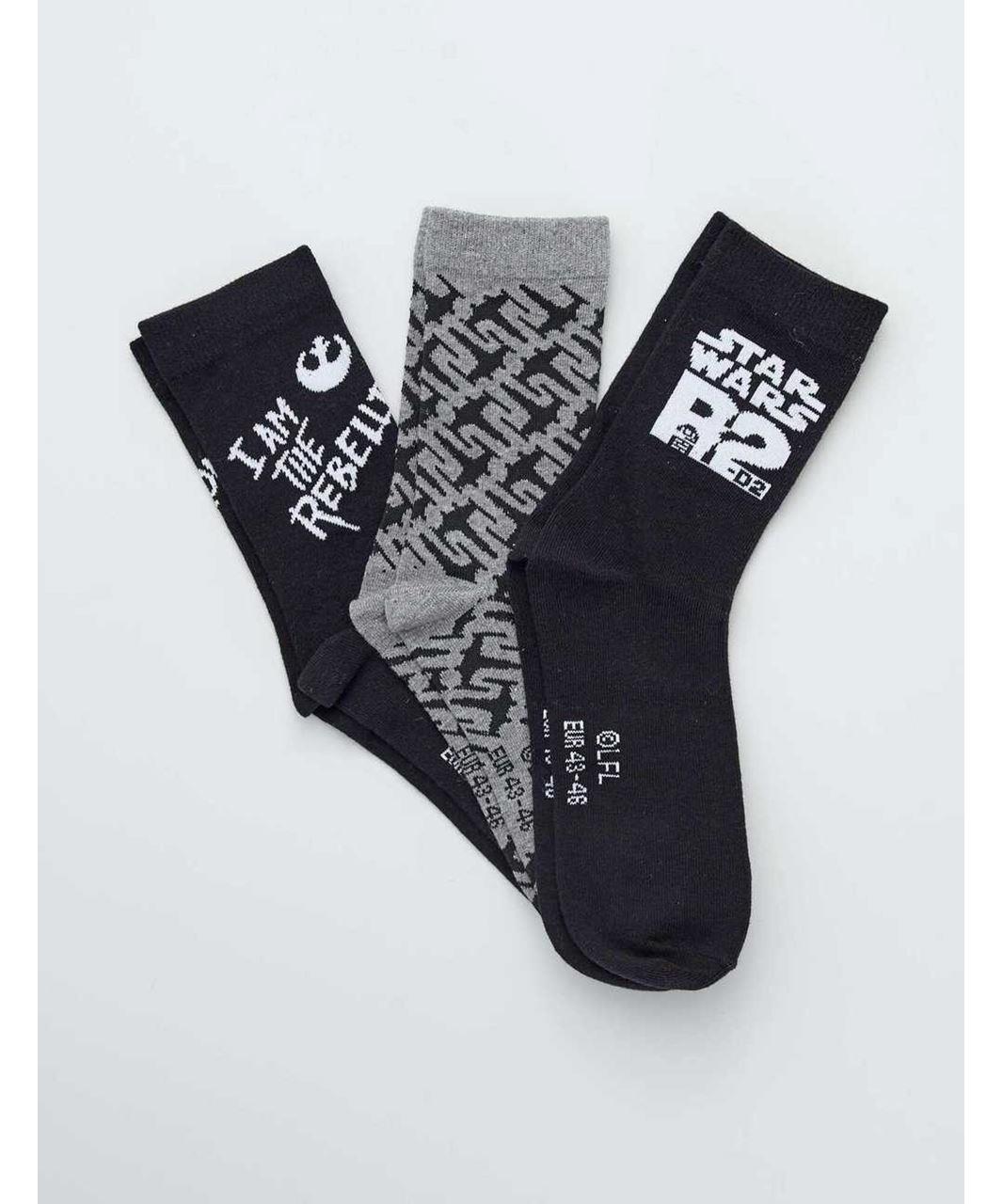 Комплект от 3 памучни чорапа с тематичен Star Wars дизайн: два черни с принтове и един сив с геометричен мотив. Меки, дишащи и удобни за ежедневно носене, размер EU 43-46. Подходящи за подарък и спорт