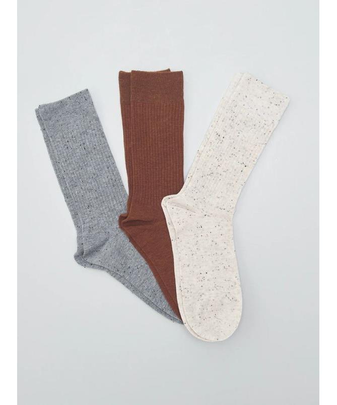 Комплект 3 памучни чорапа в неутрални тонове — сиво, тъмно кафяво и кремаво. Меки, дишащи и удобни за всеки ден, с еластична лента за стабилно прилягане. Лесни за поддръжка. Налични размери S–XL. 100%