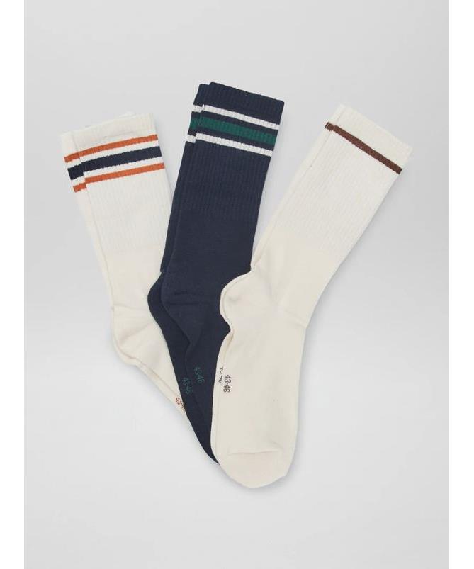 Пакет от 3 чифта чорапи в спортен стил: два кремави и един тъмносин, с контрастни райета. Меки, дишащи и удобни за всекидневна употреба. Универсален размер, лесни за поддръжка. Състав: памук и еластан.