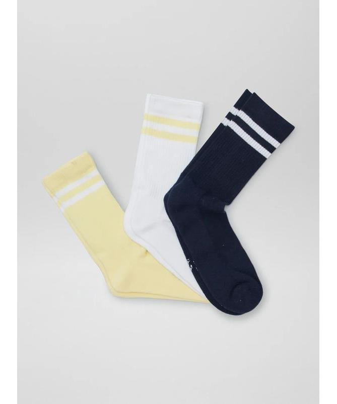 Комплект от 3 чифта памучни чорапи в жълто, бяло и тъмносиньо. Спортен дизайн с контрастни ивици, еластичен маншон и мек памук за дишащ комфорт. Подходящи за всеки ден. Перат в машина, запазват форма.