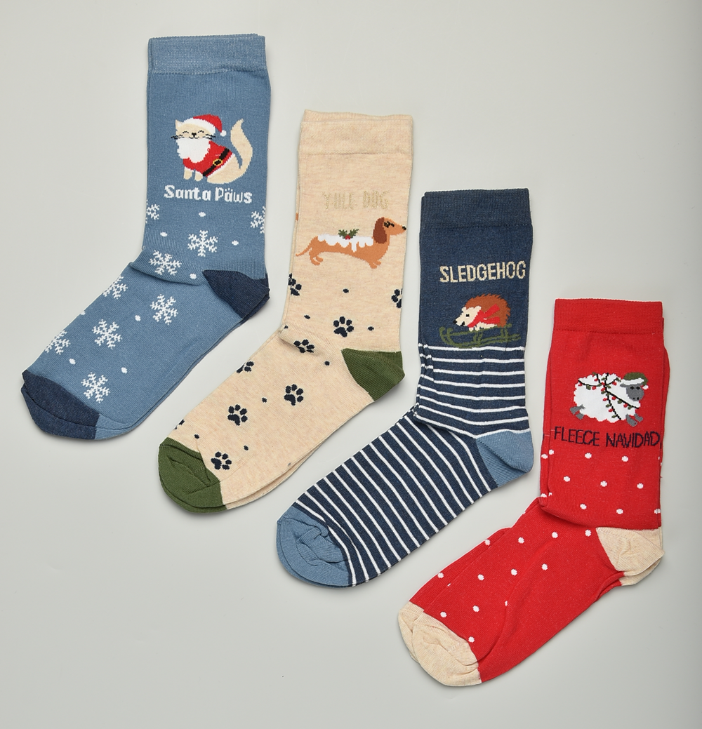 Комплект от 4 памучни чорапа с коледни мотиви: котка Дядо Коледа, такса с лапички, таралеж на шейна и овца. Меки, удобни и цветни – идеални за подарък или всекидневна употреба. Пране при 40°C. Машина!
