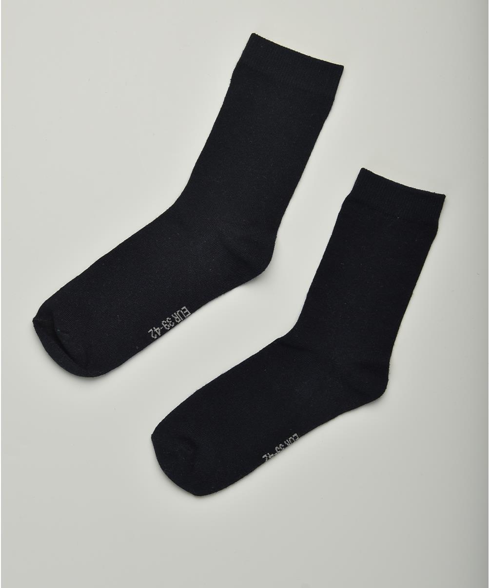 Черни класически чорапи до средата на прасеца, изработени от мека памучна смес с еластан. Еластична маншета, подсилена пета и плавен шев на пръстите. Подходящи за ежедневие и работа. Машинно пране 40C