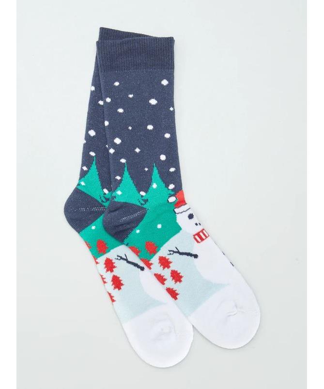 Памучни коледни чорапи с ефектен зимен мотив – снежен човек, борчета и падащ сняг. Меки, дишащи и удобни за ежедневно носене, перфектни за уют и подарък през студените месеци. Стилни с дълготраен цвят.