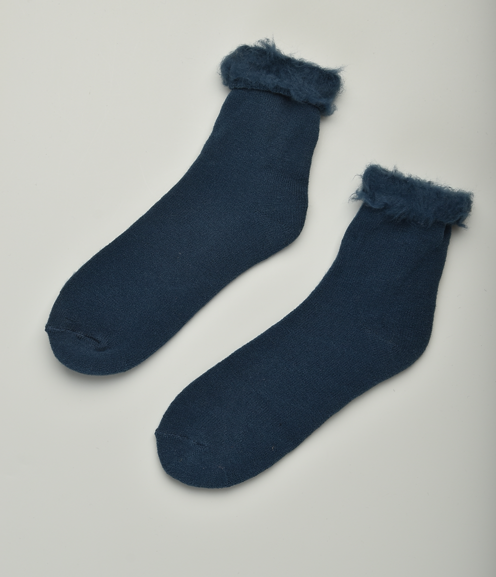 Топли и меки дамски чорапи в тъмносин цвят с пухкава рипсена маншета. Изработени от комфортна материя, идеални за вкъщи и студено време, осигуряват уют и добра терморегулация. Перфектни за подарък. Уют.