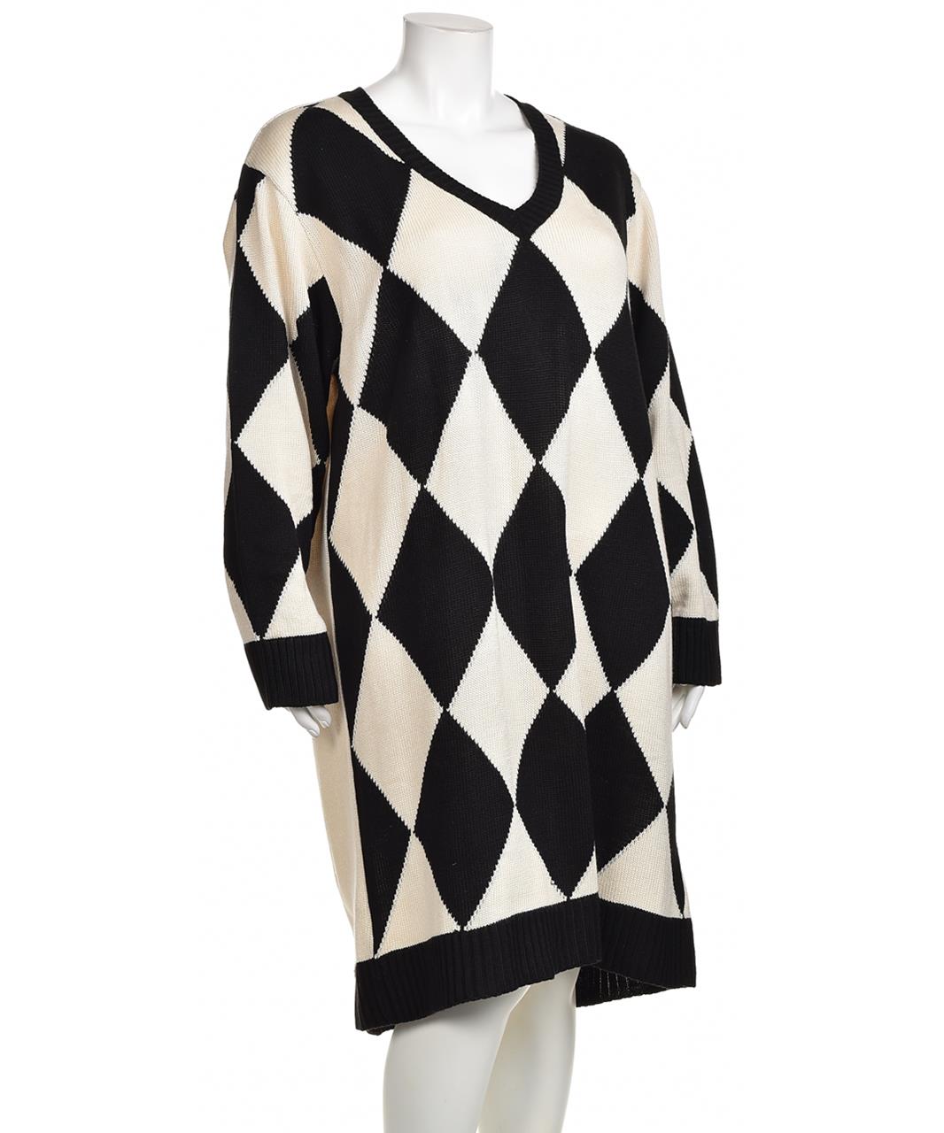 Елегантна плетена рокля с изразителен ромбоиден десен в черно и кремаво. Свободен силует, V-образно деколте и дълъг ръкав. Мекота и комфорт за ежедневен и офис стил. Идеална за есен и прохладни вечери