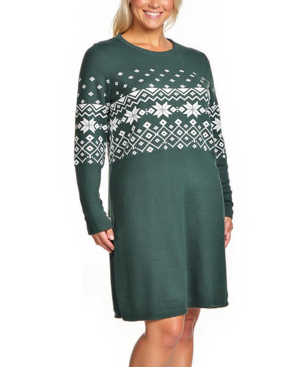 Елегантна плетена рокля от памук в тъмнозелено с бял фолклорен мотив на горната част. Мека, дишаща и удобна, с дълъг ръкав и права кройка — идеална за ежедневие и студени дни. Лека и лесна за поддръжка.