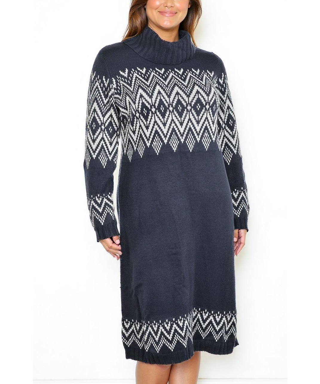 Плетена рокля с висока поло яка и дълъг ръкав, в тъмносиньо с бели геометрични мотиви по гърдите, ръкавите и подгъва. Топла, мека и елегантна за студен сезон. Подходяща за офис и ежедневен стил. Уютна