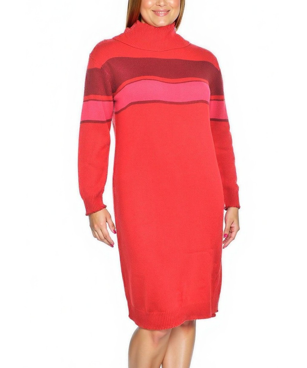 Елегантна плетена рокля в наситено червено с розови и бордо райета. Поло яка, дълги ръкави и неопренена кройка до коляното. Мека, топла материя и изчистен силует за всеки ден. Удобна за офис и уикенд.