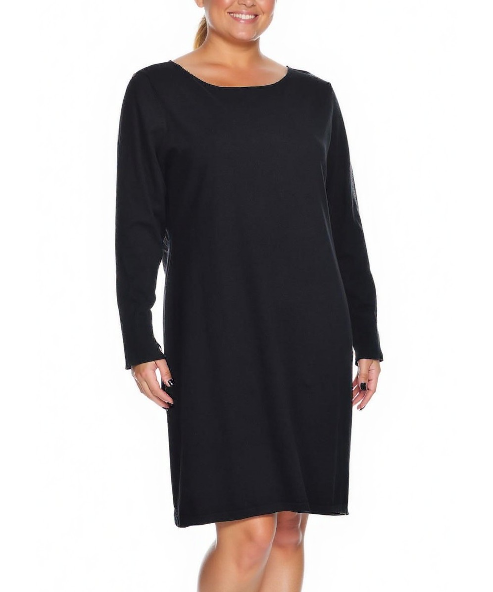 Плетена рокля от 100% памук с кръгло деколте и дълги ръкави. Прав, свободен силует за комфорт. Меко, дишащо трико; лесна поддръжка. Универсален черен модел за офис и всекидневие.
