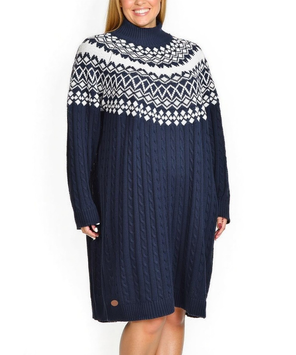 Мека памучна плетена рокля в тъмносиньо с бял норвежки мотив на горната част. Свободна кройка, висока яка и дълги ръкави. Топла, удобна и стилна за есенно‑зимни визии. Подходяща за всеки ден и празник.