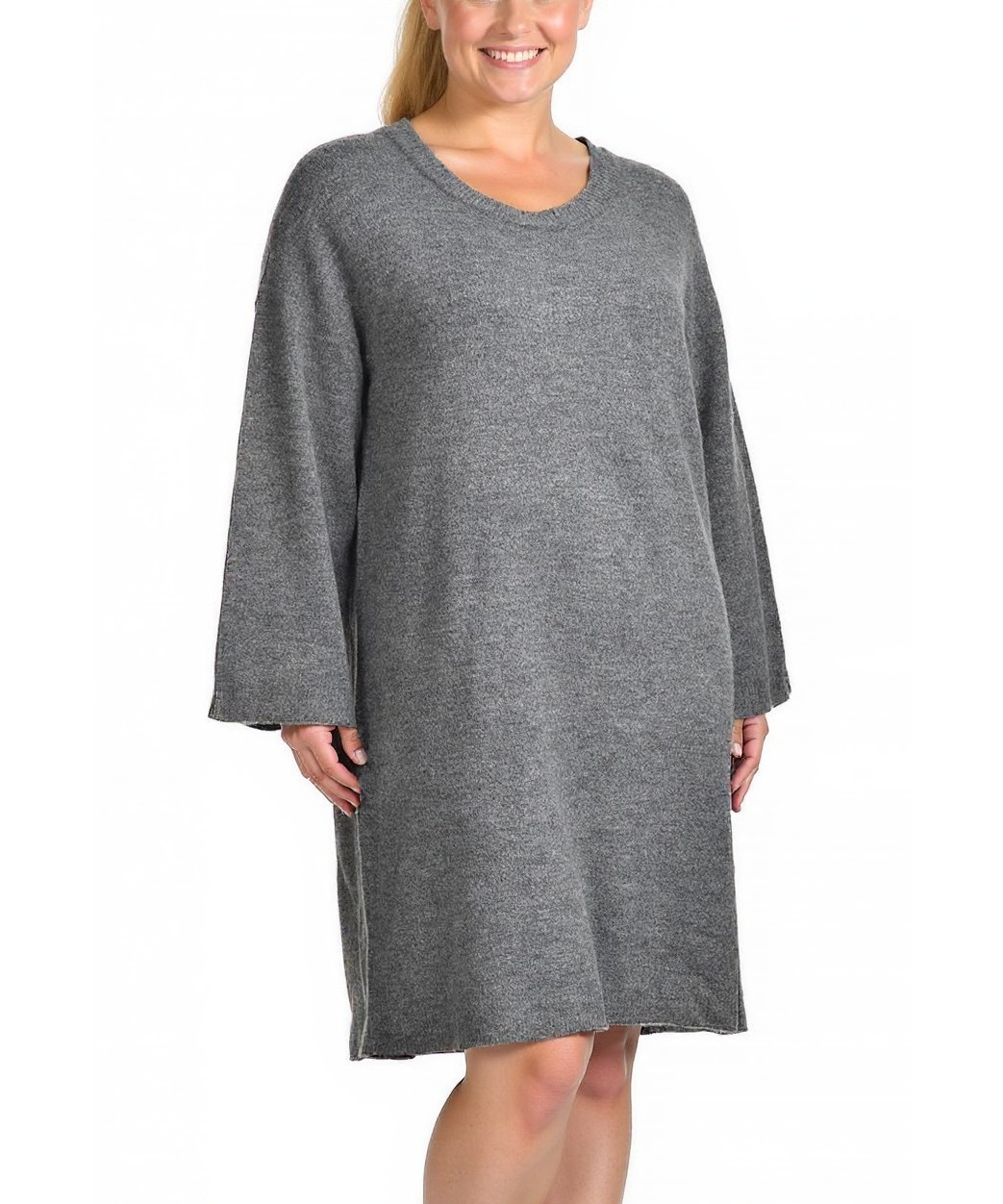 Елегантна плетена рокля в сив меланж, с кръгло деколте и широки ръкави. Свободна кройка за комфорт и топлина. Универсална за ежедневие и работа, съчетайте с ботуши или спортни обувки. Стилен ежедневен
