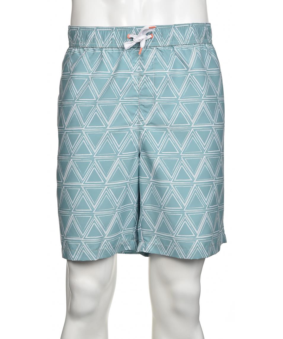 Плувни шорти със светлосиня основа, декорирани с геометричен триъгълен мотив в бяло. Шортите имат еластичен колан с връзка за регулиране на ширината, подходящи за плаж или басейн.