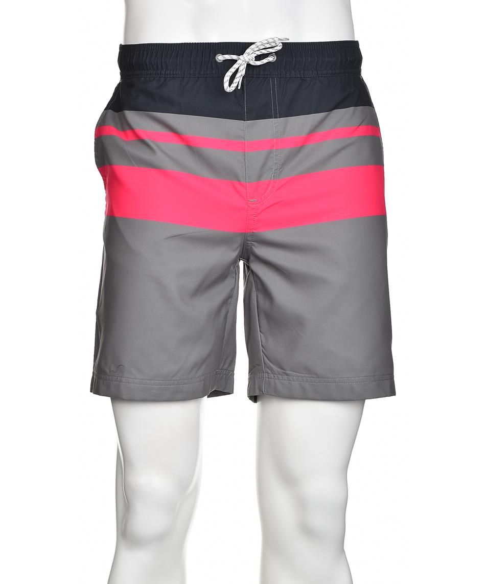 Плувни шорти с изчистен дизайн, включващ основен сив цвят и контрастни розови и черни линии. Еластична талия с връзки за регулиране и удобство при носене. Подходящи за плаж или басейн.
