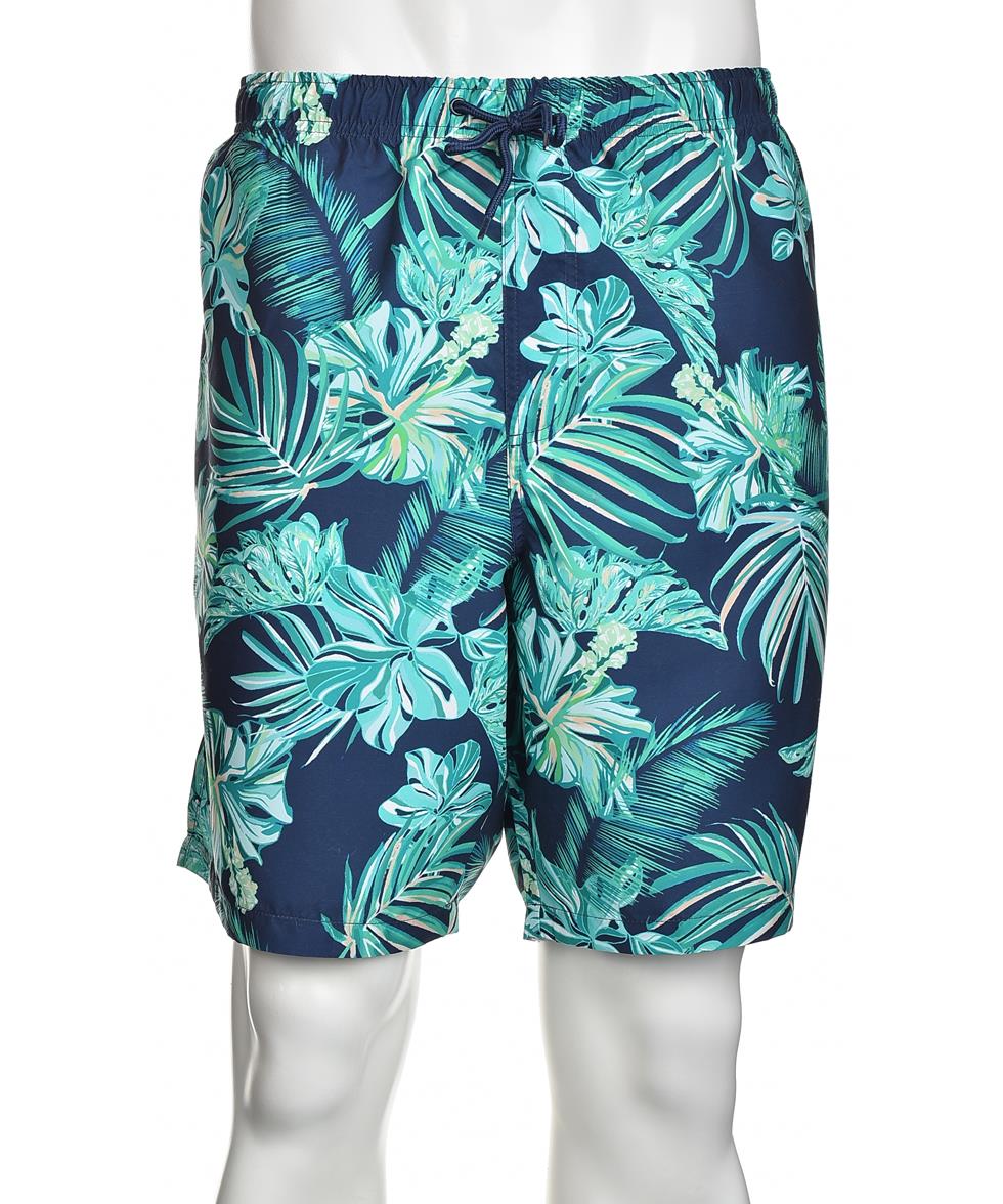 Плувни шорти с тропически мотиви в тъмносиньо и зелено. Изработени от лек и бързосъхнещ материал, с еластичен пояс и връзка за регулиране. Перфектни за плаж или басейн.