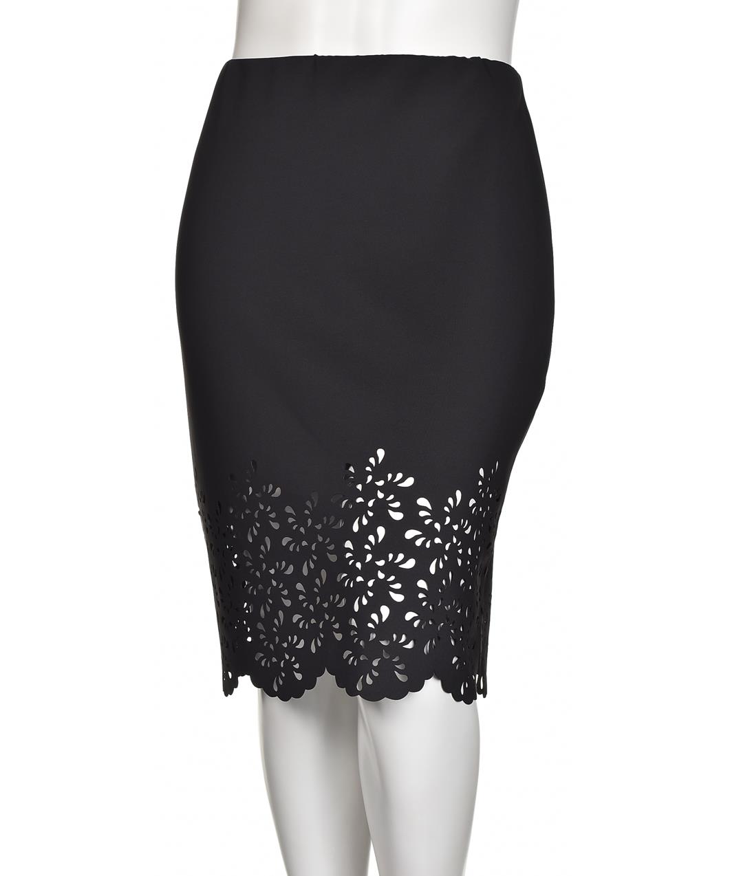 Елегантна черна пола с лазерно изрязани декоративни мотиви по долния край. Прилепнал силует, подходяща за официални поводи. Средна дължина, която придава изисканост и класа.
