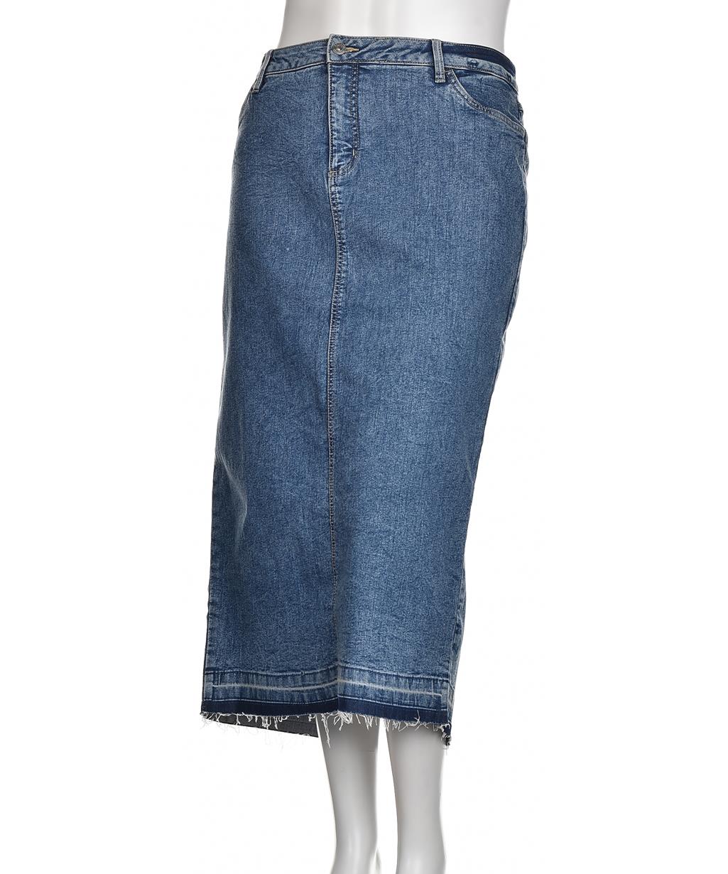 Дънкова пола от 100% памук, прав силует до прасците. Висока талия, предни джобове, цип и копче, необработен ръб. Универсална и удобна - идеална за ежедневни и по-ежедневни визии. Подходяща за сезона. ОК.