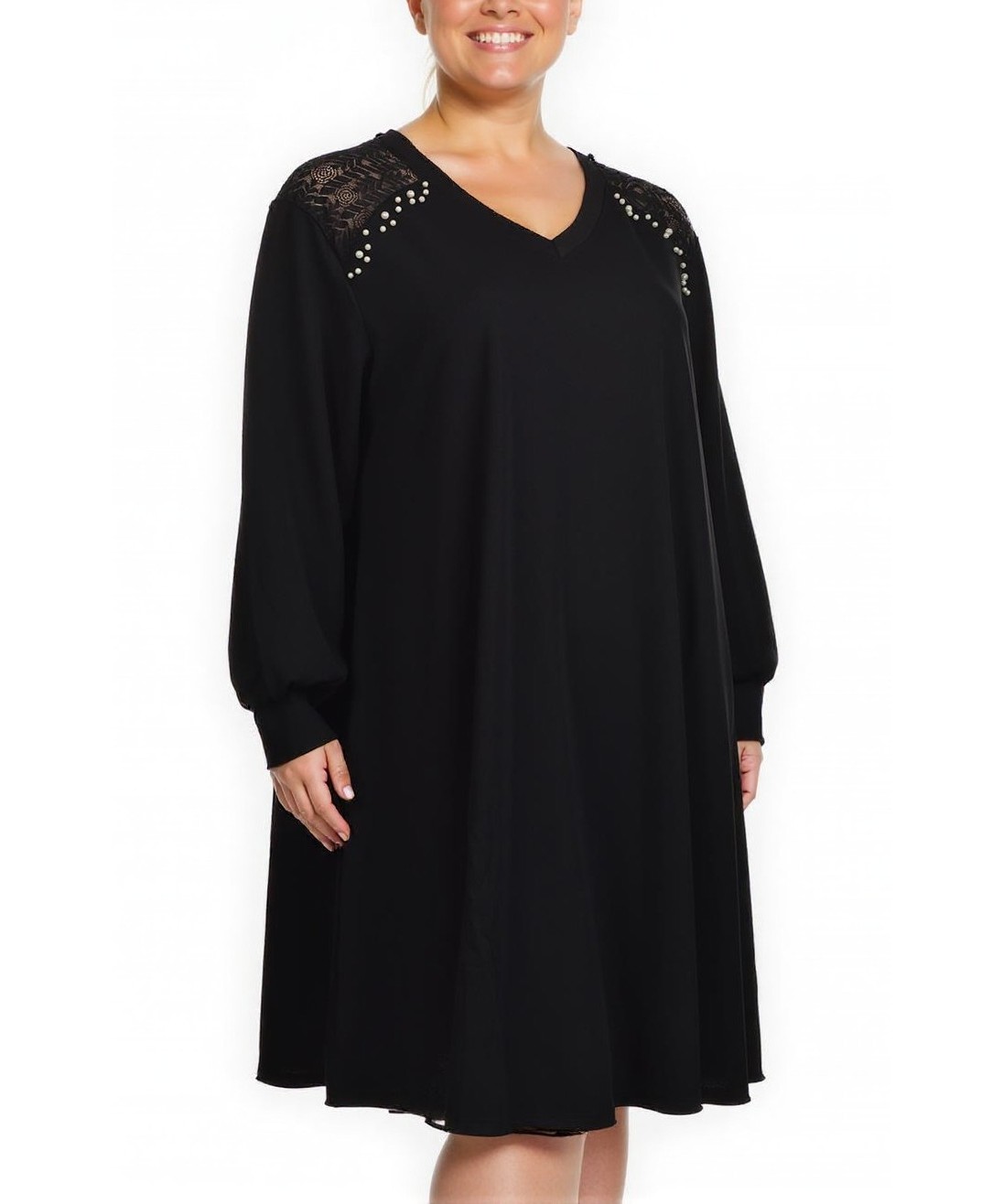 Черна разкроена рокля до коляното с V-образно деколте и дълги ръкави. Декорирана с дантела и метални капси на раменете, удобна и елегантна, подходяща за ежедневни и официални поводи. Удобна и стилна!!