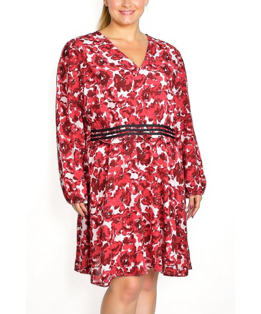 Елегантна рокля от вискоза с червено-бял цветен принт, V-образно деколте, дълги набрани ръкави и подчертан бюст с ластик и черни декоративни ленти. Лека, ефирна и подходяща за всеки ден. Универсална!!
