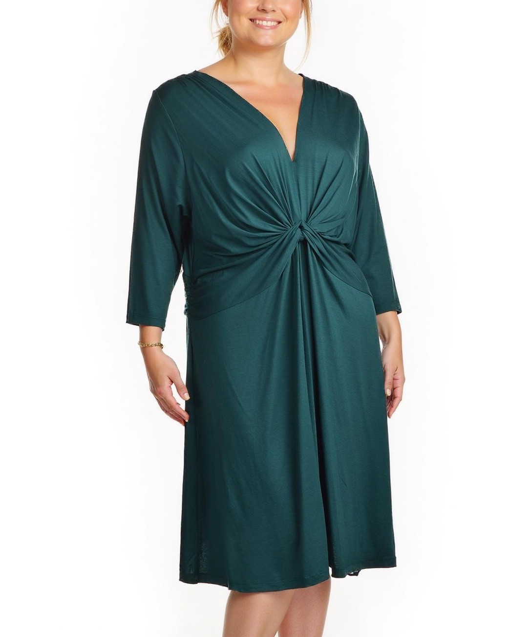 Елегантна рокля от вискоза в дълбоко зелено с V-образно деколте и драматична възелна детайл на талията. Комфортна, мека материя, 3/4 ръкави и средна дължина за стил и удобство. Подходяща за всеки ден.
