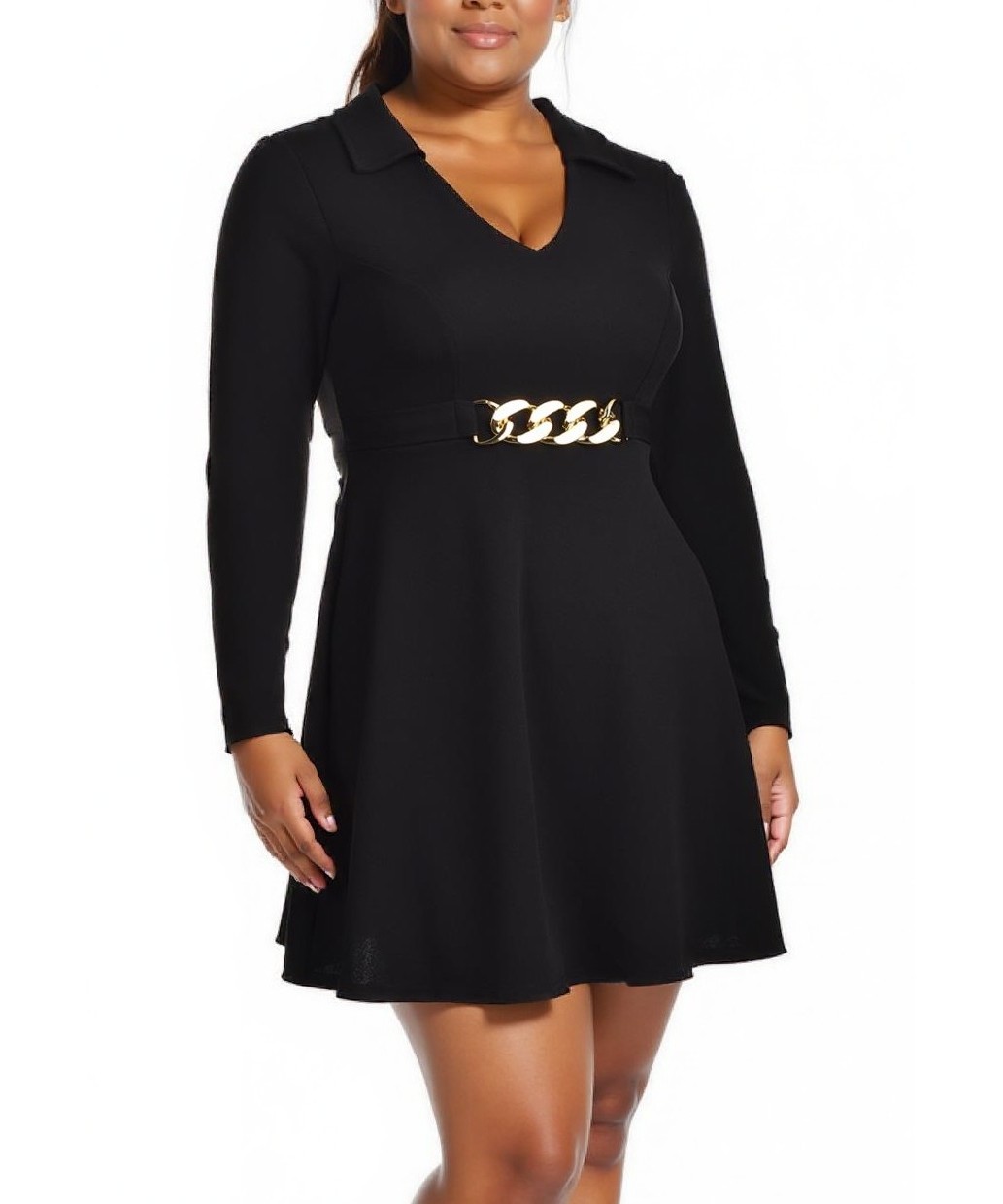 Елегантна черна рокля с дълъг ръкав, V-образно деколте и яка. А-силует, подчертана талия с златиста верижка. Подходяща за официални и ежедневни поводи, удобна и стилна. Подсилена еластична материя XL