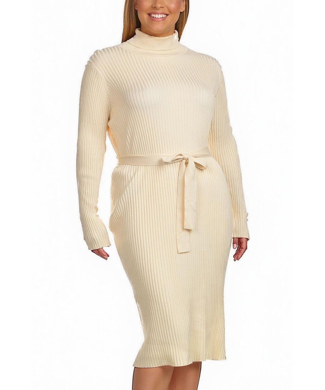 Елегантна рокля от вискоза в кремаво, рипсен трикотаж, висока яка и дълги ръкави. Миди дължина с акцент колан на талията. Мека, еластична и подходяща за ежедневно и офис носене. Подчертано женствена!!