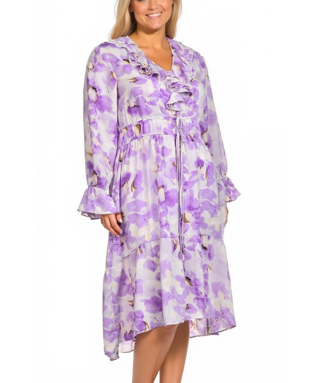 Лилава шифонена рокля с шарка на цветя, V-деколте и волани. Дълги ръкави с къдри, регулируем талиеен шнур и ефирна, свободна кройка — перфектна за пролетни и летни тържества. Стилна и удобна. Идеално.