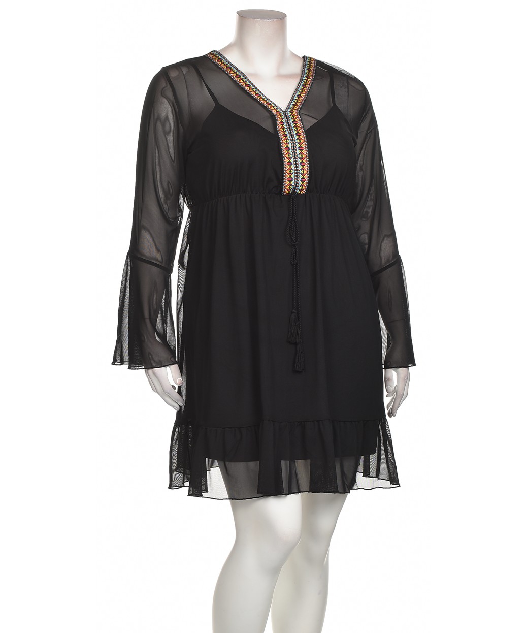 Елегантна черна шифонова рокля с прозрачни ръкави, втален талия с връзки, ефектен шарен декор по V-деколтето и волан по подгъва. Лека, подходяща за вечерни и ежедневни тоалети. Налична в размери S-XXL.