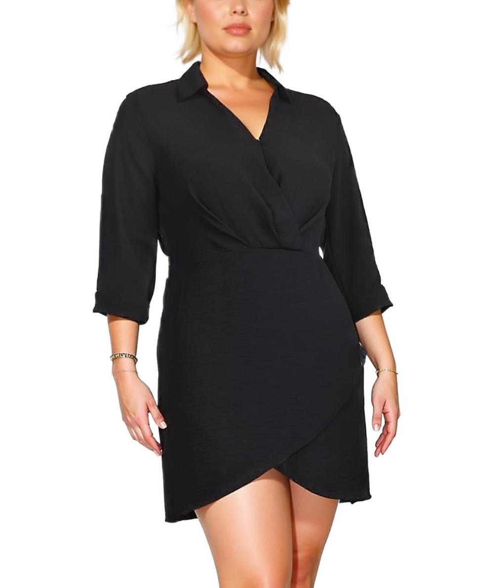 Елегантна черна рокля с яка и V-деколте, 3/4 ръкави и пресичаща се предна част. Подчертава талията с асиметрична пола - идеална за офис и официални поводи, комфортна и стилна. Подходяща за всеки ден.