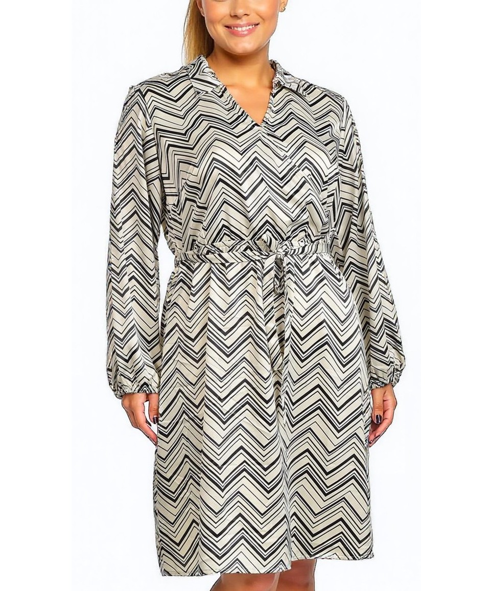 Елегантна рокля с чернобял зигзагообразен десен Vобразно деколте и дълги ръкави с ластични маншет. Колан подчертава талията. Дължина до коляното, подходяща за офис и ежедневие. Лека и приятна материя.