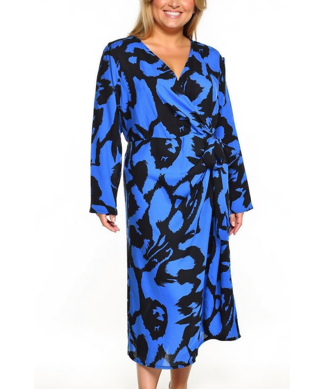 Рокля от вискоза с контрастен синьо-черен принт, V-образно деколте и елегантен възел на талията. Дълги ръкави, midi дължина, мека и дишаща материя — стилна и удобна за всеки повод.