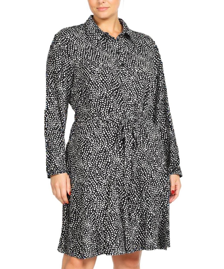 Стилна дамска рокля с черно-бял принт на точки. Има яка и дълги ръкави, с връзки на талията за подчертаване на силуета. Подходяща за ежедневни или по-официални събития.