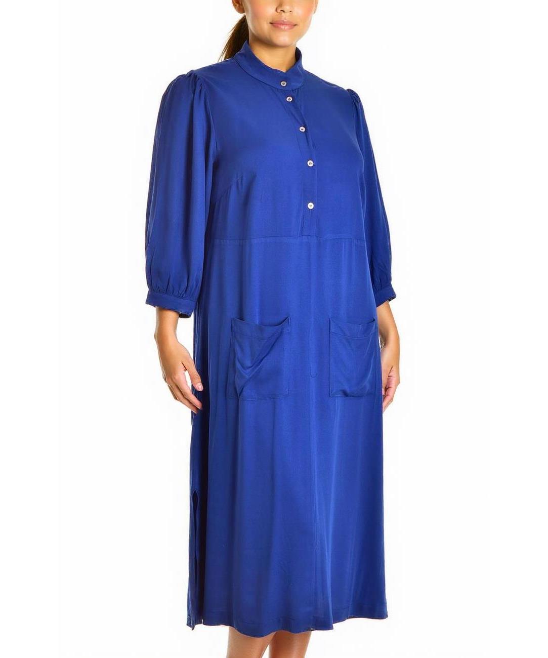 Синя рокля от вискоза в midi дължина с прав силует, ръкави с маншет и щандова яка, закопчаване с копчета отпред и два предни джоба. Удобна, елегантна и подходяща за всеки ден. Лека и дишаща тъкан плюс