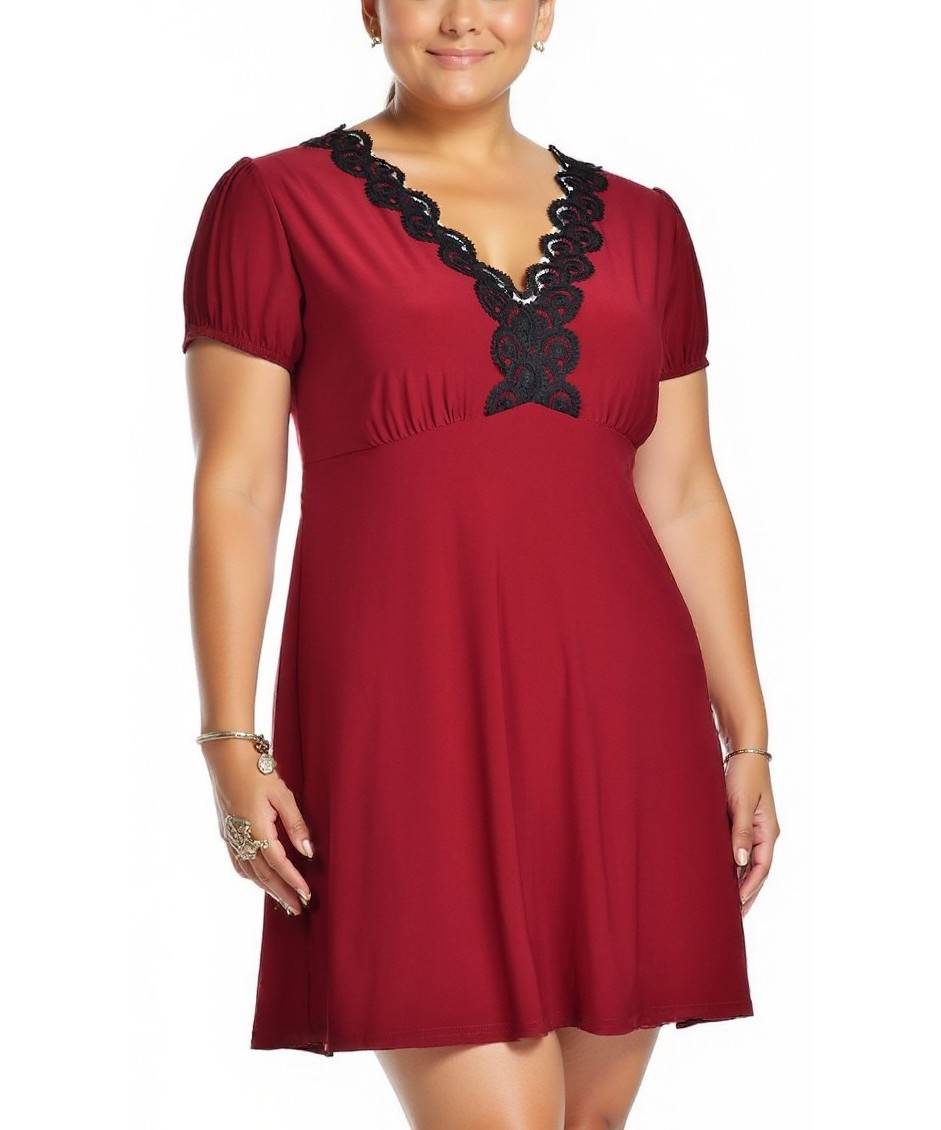 Червена рокля с къси ръкави и V-образно деколте, украсено с черна дантела. Материята пада леко и придава елегантност. Подходяща за ежедневни и по-официални събития.