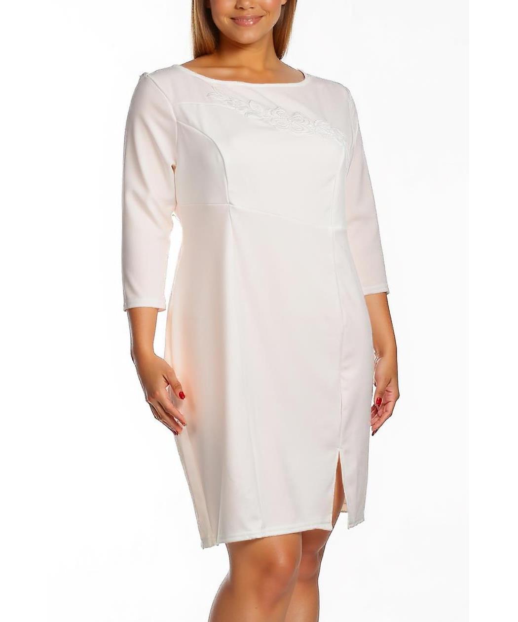 Елегантна бяла рокля с три четвърти ръкави и овално деколте. Декорирана с деликатен цветен мотив на гърдите. Прав силует със странична цепка за удобство и свобода на движение.