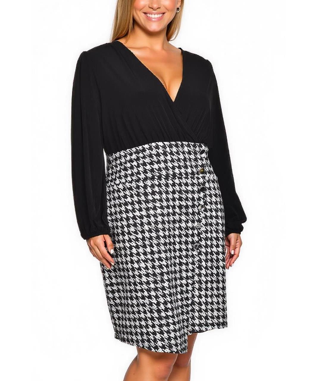 Елегантна рокля с V-деколте и дълги ръкави. Горна част в черно, пола с графичен черно-бял хаундстут десен до коляното. Подчертана талия и модни декоративни копчета. Удобна и стилна. Перфектна за офис.