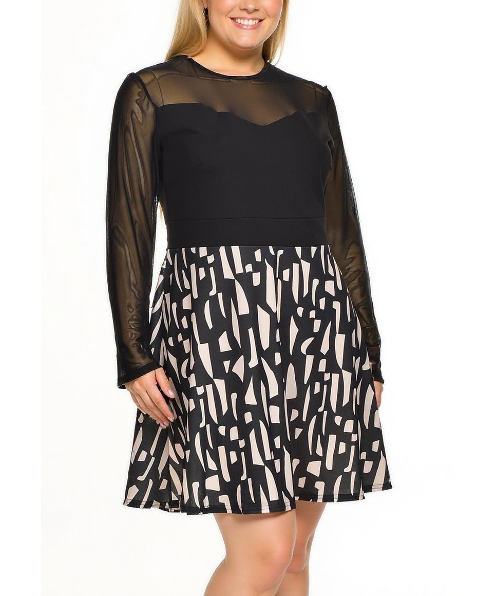 Елегантна рокля от вискоза с тюл горна част и дълги прозрачни ръкави. Втален корсет и разкроена пола с черно-бял абстрактен принт. Удобна, стилна и подходяща за официални събития. Мека подплата, лесна