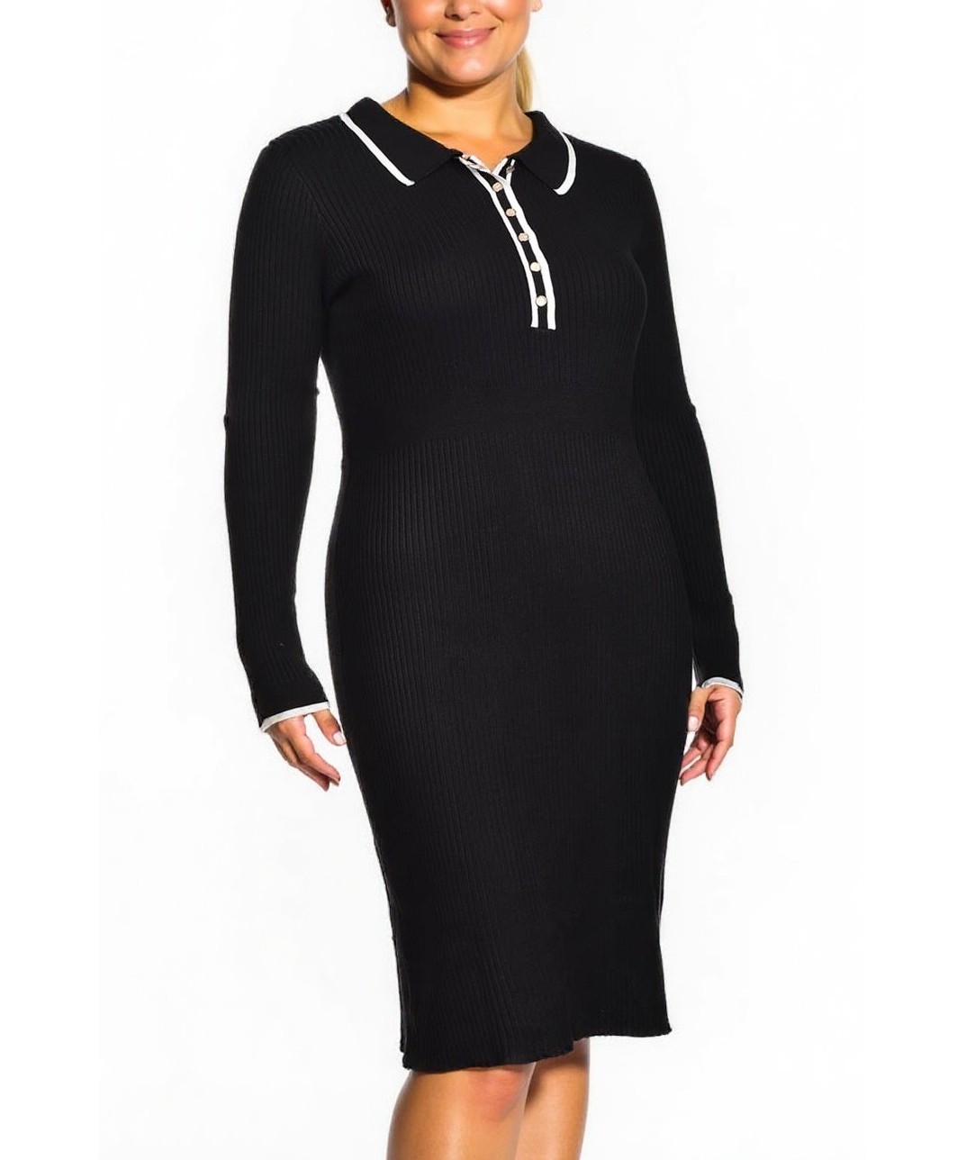 Елегантна черна рокля от вискоза с единично релефно плетиво, прилепнал силует, дълги ръкави и контрастна яка с копчета. Удобна, стилна и подходяща за офис или ежедневие. Лесна за пране, мека и удобна!!
