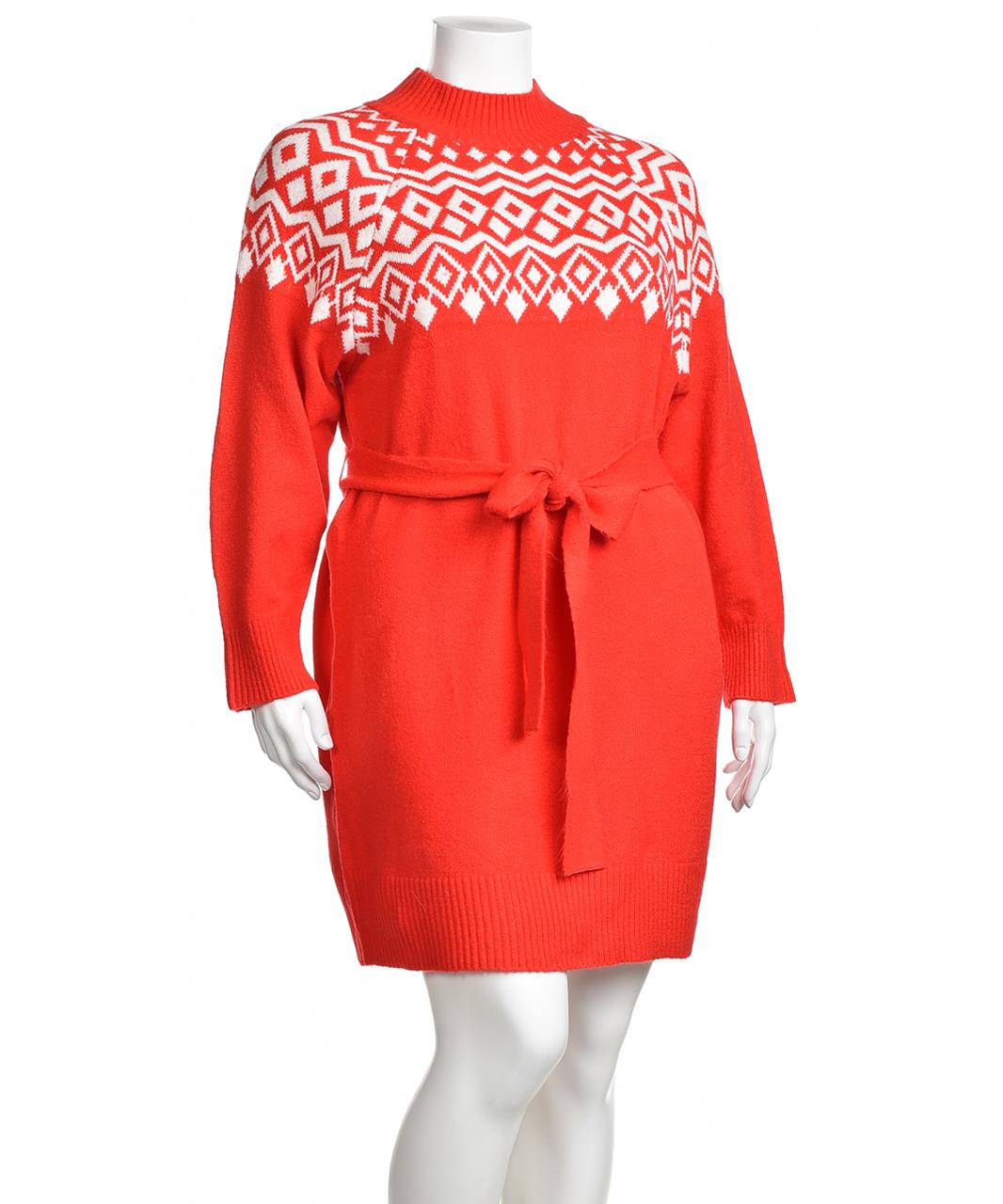 Червена плетена рокля пуловер с бяла феър-айър рисунка на горната част, рипсова висока яка, дълги ръкави и колан за вталяване. Топла, удобна и стилна за зимни ежедневни визии. Уютна и стилна опция XL.