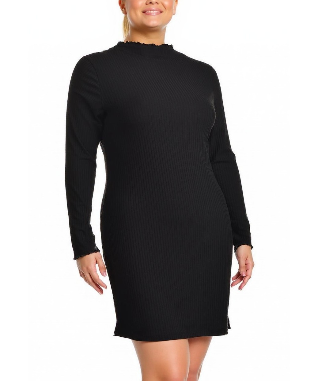 Елегантна черна рокля от вискоза с прилепнала, но удобна силуетна линия. Дълги ръкави, фин рипсен релеф и нежни къдрици на деколтето и маншетите. Дишащ материал, лесна поддръжка.