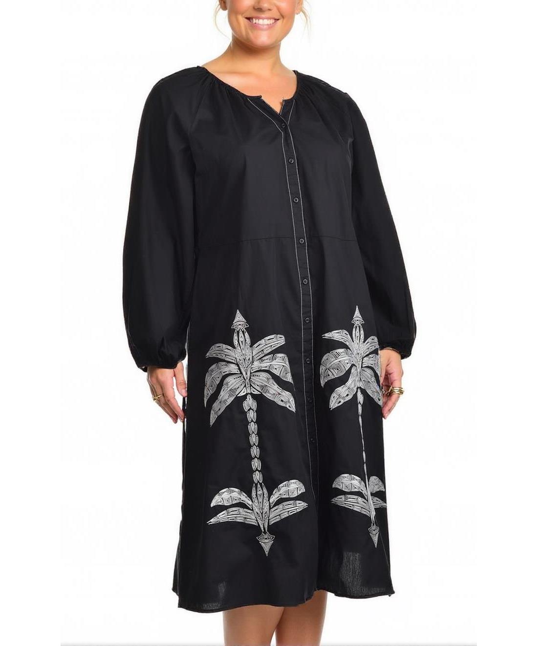 Черна памучна рокля с копчета отпред, дълги ръкави и свободна линия. Декорирана с бели палмови мотиви отпред, средна дължина, удобна и стилна за всеки ден или лека елегантност. Лека за поддръжка. 100%