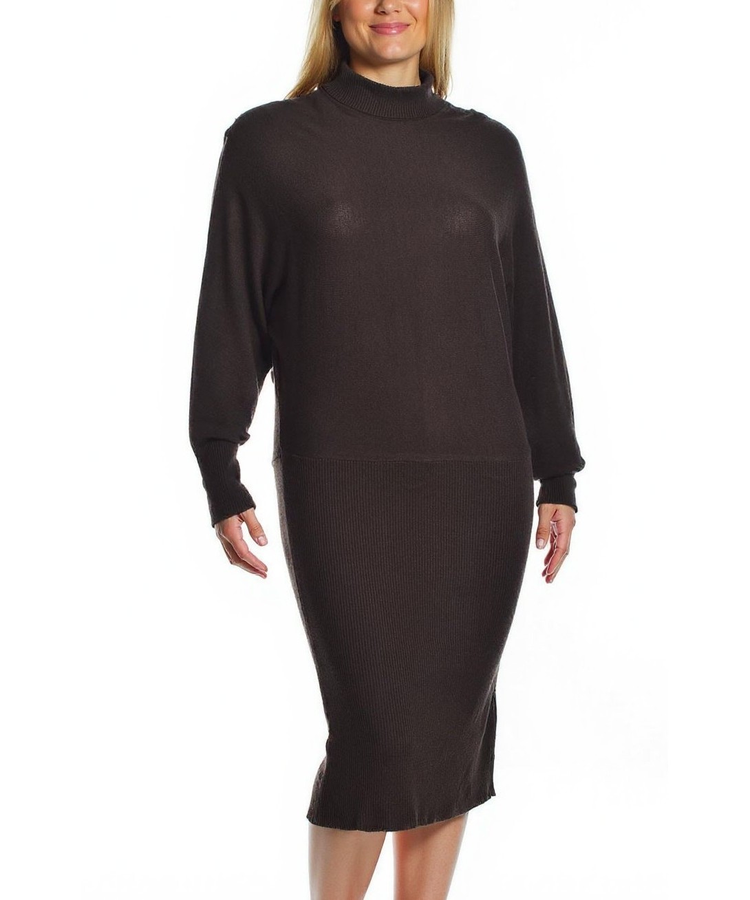 Елегантна рокля от вискоза в кафяво. Миди дължина, поло яка и широки ръкави тип прилеп, оформяща подплатена талия с плетена долна част. Мека, дишаща, идеална за ежедневие и офис. Стилен избор. За зима!