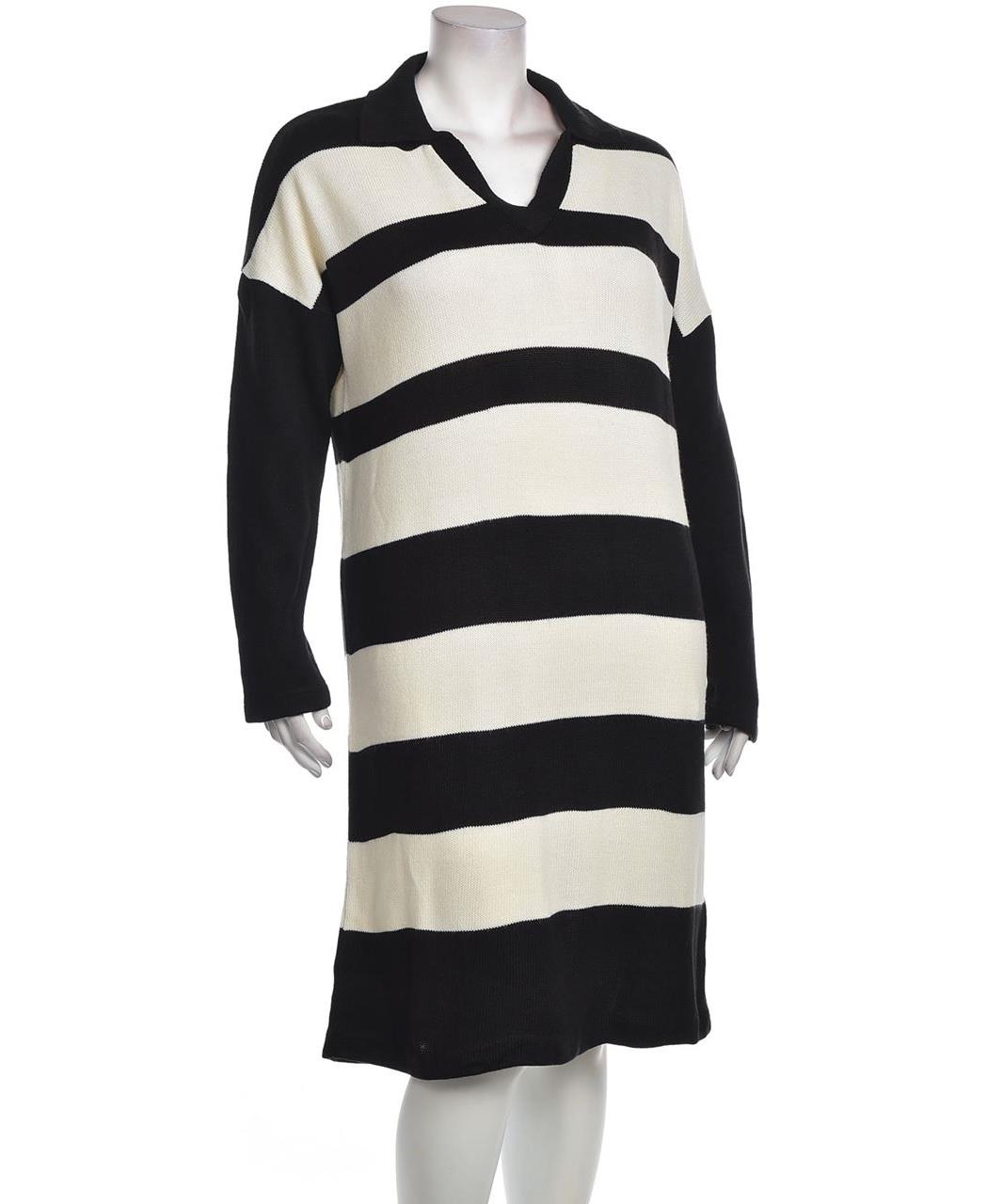 Черно-бяла плетена рокля с широки хоризонтални райета, свободен силует и дълъг ръкав. Има обло V-деколте с яка, средна дължина, удобна и стилна за ежедневие и по-лежерен градски аутфит. Модерен избор.