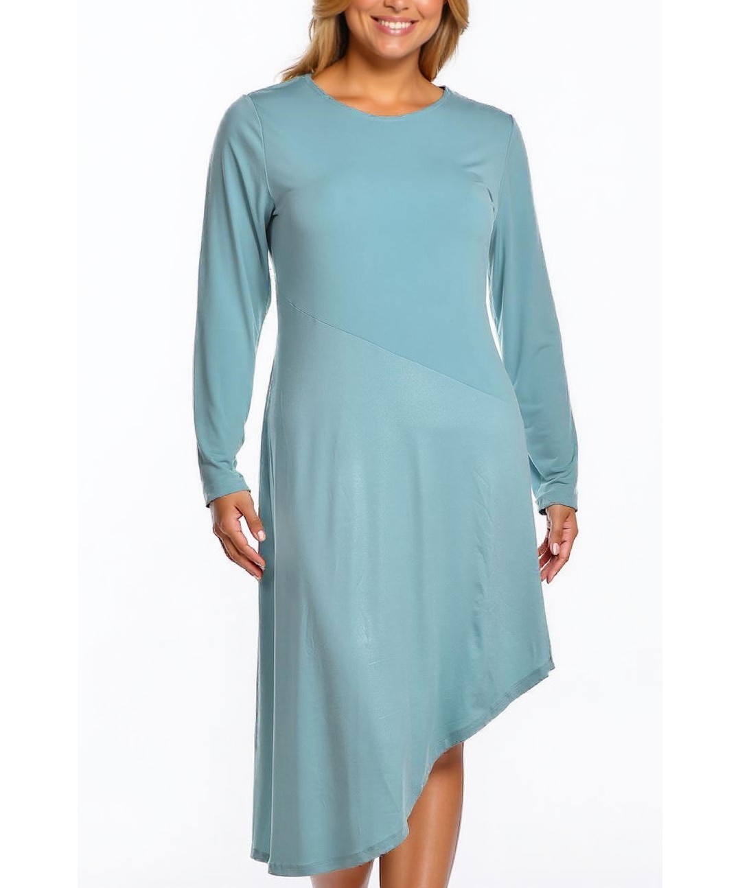 Елегантна асиметрична рокля в светъл тюркоазен нюанс, с дълги ръкави и кръгло деколте. Лекият, падащ силует подчертава женствеността и осигурява комфорт за официални и ежедневни поводи. Машинно пране.