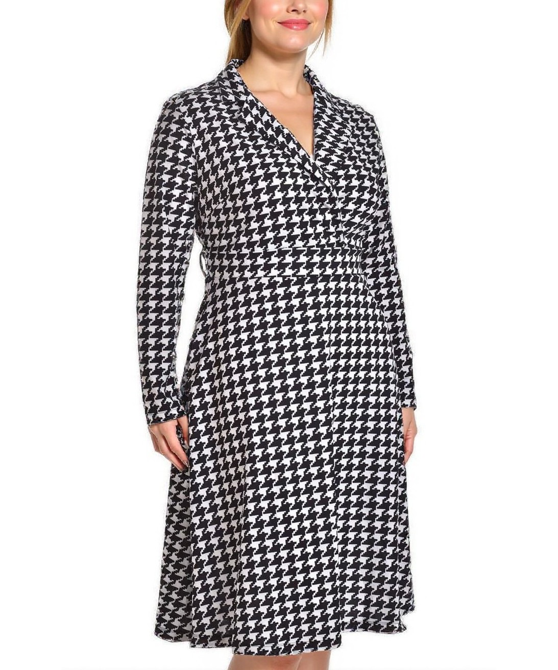 Елегантна рокля в черно и бяло с класически десен „гъши крак“, дълъг ръкав, V-деколте с ревери и подчертана талия. Мека разкроена пола, удобна и подходяща за офис и официални събития. Стилна и модерна