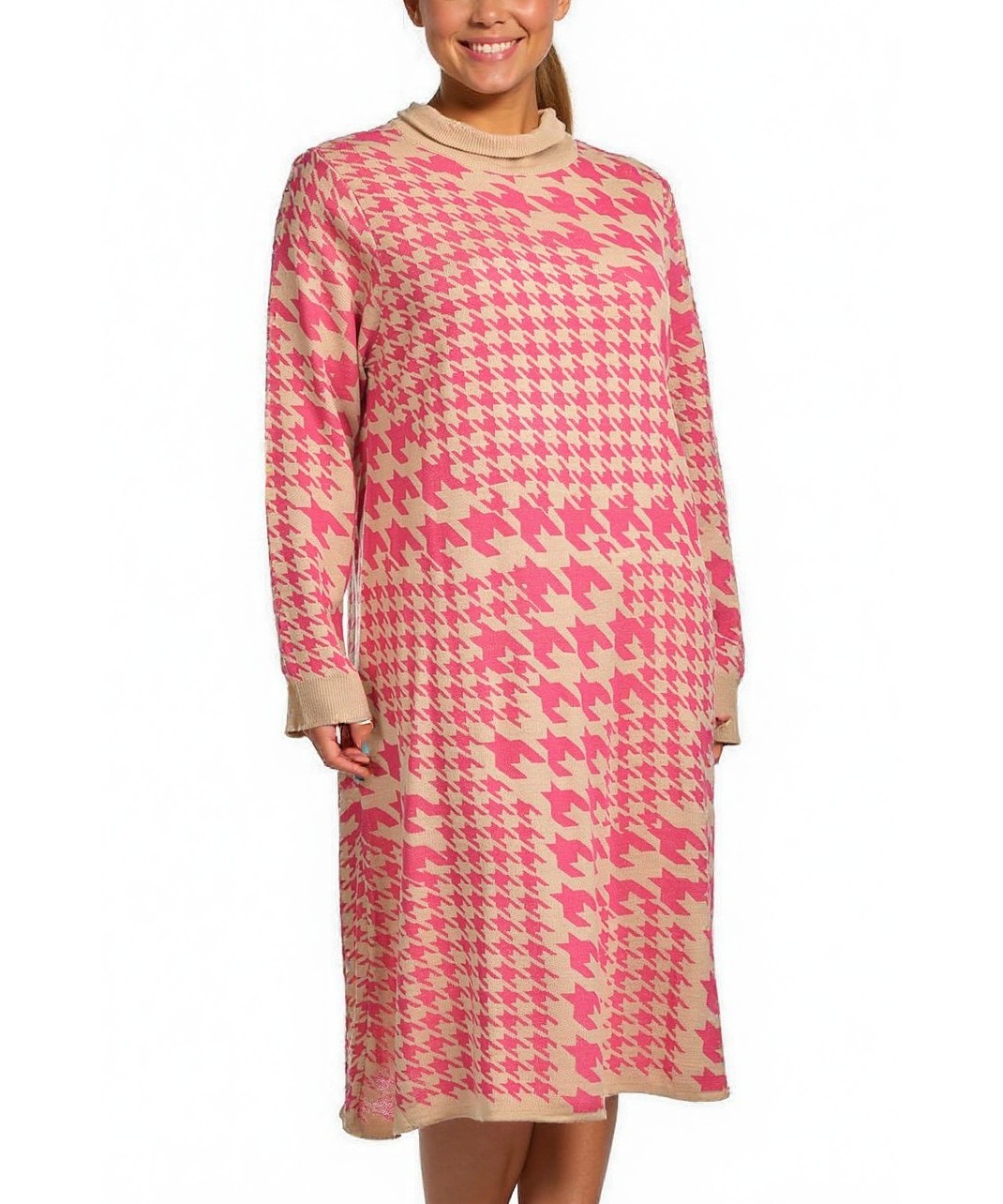 Релаксирана рокля тип пуловер в бежово и розово с голям „гълъбов зъб“ десен. Дълги ръкави, леко отпускана кройка, средна дължина. Удобна, стилна и подходяща за ежедневно носене. Идеална за офис и уик.