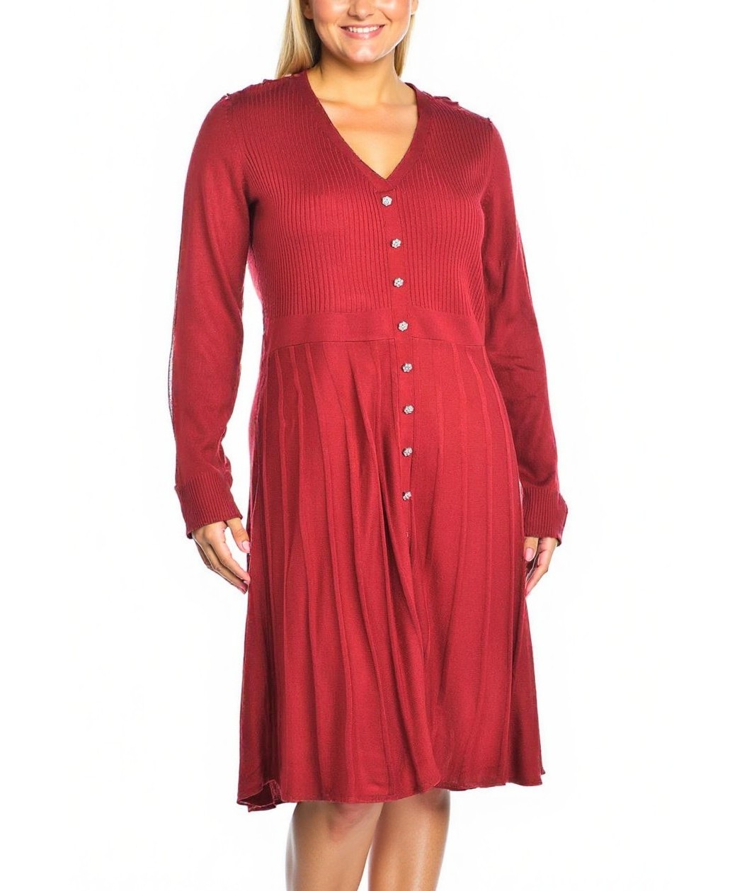 Елегантна дамска рокля в бордо, средна дължина до коляното, с V-деколте и ред копчета отпред. Дълги ръкави, вталена горна част и свободна, набрана пола за комфорт и стил. Подходяща за всеки ден. Уютно