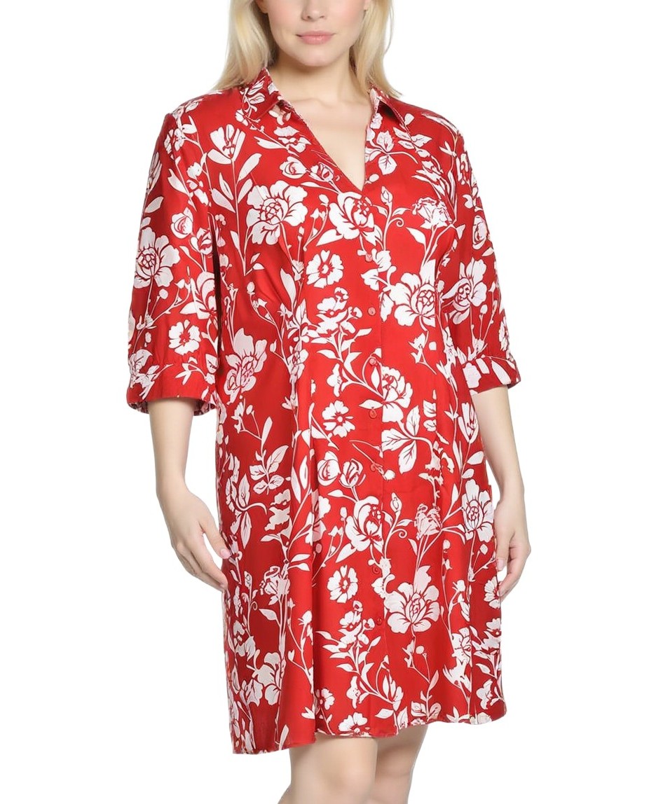 Рокля от вискоза в наситен червен цвят с изразителен бял флорален принт. Свободна кройка, поло яка, три-четвърт ръкави и мека, дишаща материя — идеална за ежедневно носене и празнични поводи. Подходящ
